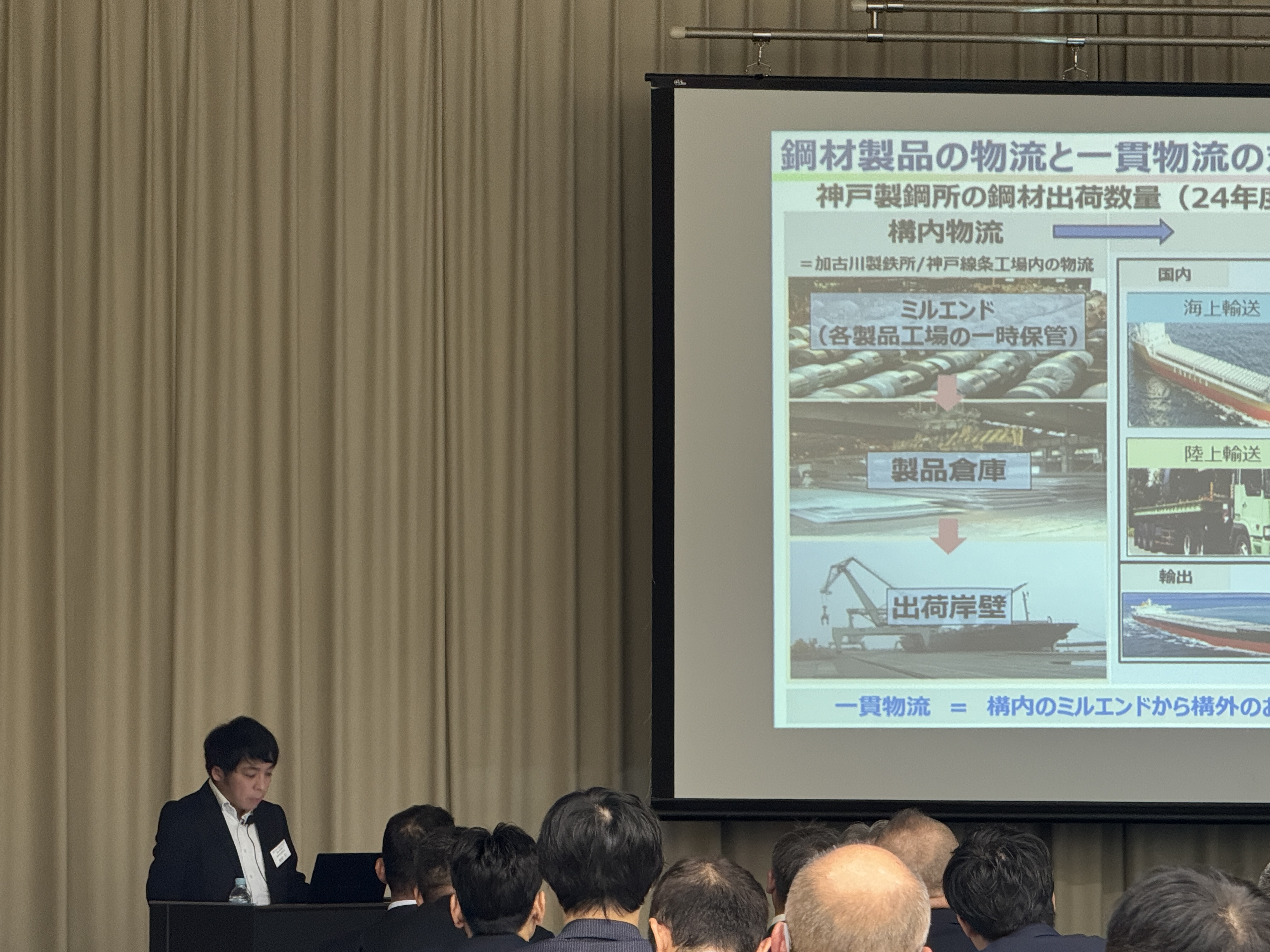 交流会では、神戸製鋼と当社が取り組んでいる鋼材製品の生産から納品までを通した物流の整流化と物流全体の最適化の活動である「一貫物流の取組み」を紹介し、今後の進展、展望について情報共有しました。その後、神戸学院大学 現代社会学部教授 中野 雅至氏を招き「企業の人材不足」についてご講演いただきました。