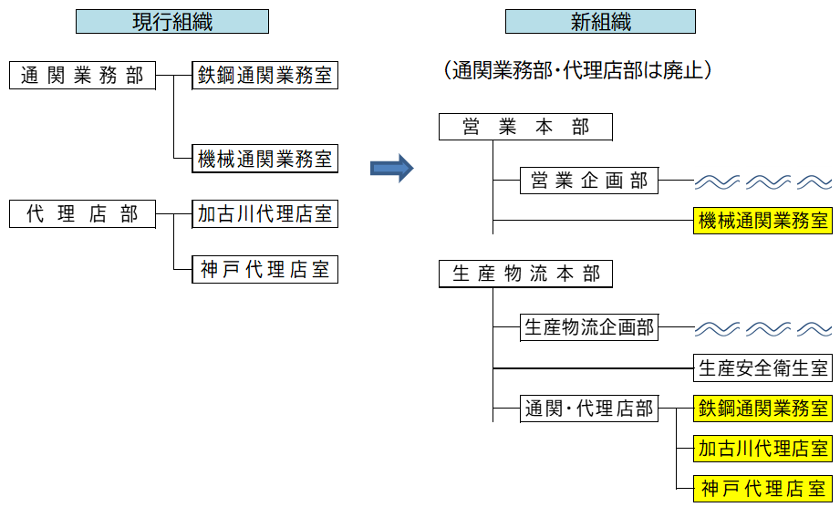 ①通関業務部 鉄鋼通関業務室と代理店部を統合し、「通関・代理店部」として